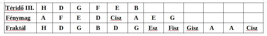 A felső sorban az első Téridő Hangjait találjuk, a második sorban a Fénykvantum Hangjait, és a harmadikban pedig a 10. variáció első ütemének Hangjait írtam be, amik az első fraktális elágazásoknak felelnek meg.