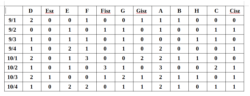 A függőleges első sorban a két variáció ütemeinek a jelzése található, a felső vízszintes sor a temperált rendszer 12 Hangját jelöli (azon elnevezéssel, ahogyan a műben elhangzik), a számok pedig hogy melyik ütemben mennyi ott megnevezett Hang vett részt.