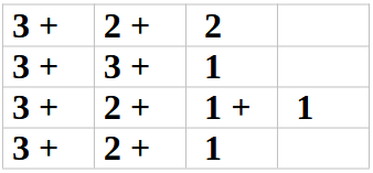 =3+3+1, vagy 7 = 4+2+1, 6 = 3+2+2, vagy 6 = 4+2, 5 = 2+2+1, vagy 5 = 4+1,