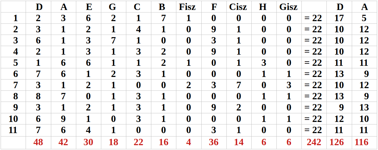 a 11. oszlopban levő Hangokat, összeadva a vízszintes 11. sorban levő