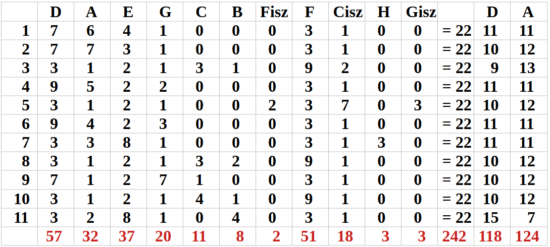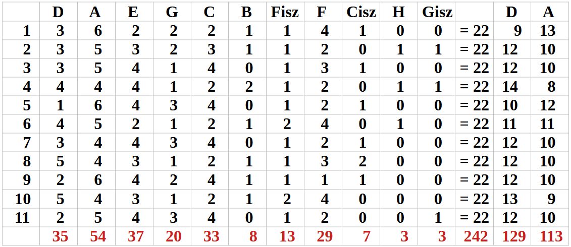 a Hangok darabszáma, az utolsó két oszlop pedig a D és az A Hangok aránya,