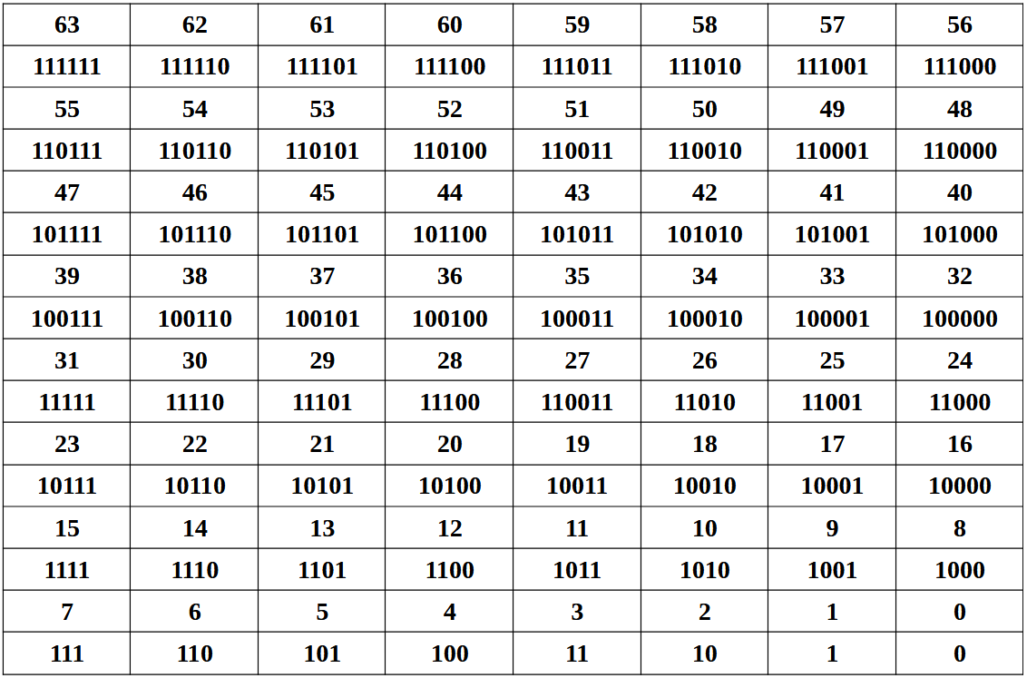 A mi általunk használt számok alatt találhatjuk a neki megfelelő kettes számrendszerben átváltott számot. Pl.: a 63-as szám megfelelője 111111, vagyis 63 = 111111.
