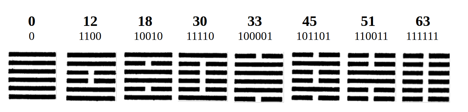 Ami még nagyon elgondolkoztató a hat (nyolc) jelben, hogy kívülről befelé haladva egymás ellenpólusát mutatják be. 0 - 63, 12 – 51, 18 -45, 30 – 33. A kódolásnak ez még csak a kezdete!