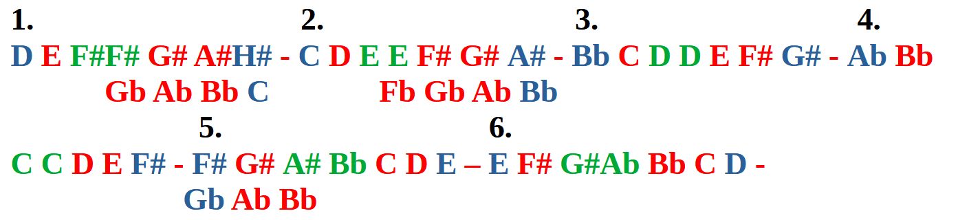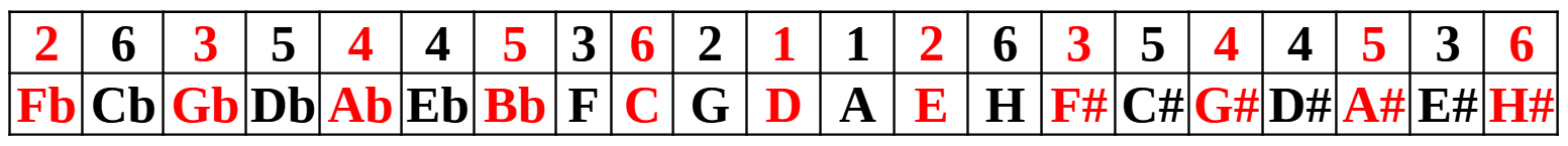 Ha az azonos színnel jelölt növekvő számokat egy oktávba tesszük, egymás melletti Hangok sorozatát kapjuk. A piros növekvő, a fekete csökkenő irányban. Egyik balos, másik jobbos irány, mint a két Téridő. Tehát kettő kvinttávolság megegyezik két egymás melletti Hang elnevezésével. Majd amikor frekvenciákkal dolgozunk, ügyelni kell arra, hogy egyedül az oktávlépés frekvenciáját hagyták meg, azok mindig duplázódnak, ez nem lett megváltoztatva.