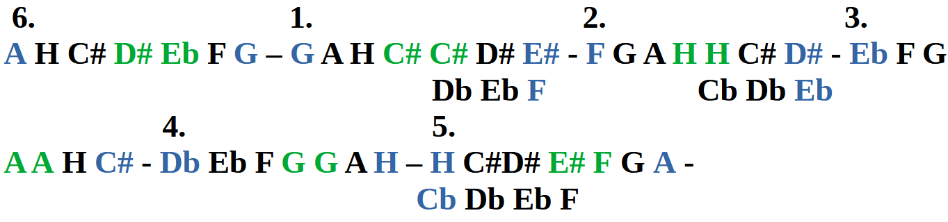 A moll hangnemeknél egy rövid megoldást mutatok. Az első oszlopban, tehát függőleges sorban elhelyezkedő Forrásszámokat egymás mellé írom le úgy, hogy a Téridő és az Anti- Téridő Forrásszámai egymást követik a könnyebb megérthetőség miatt.