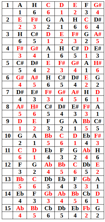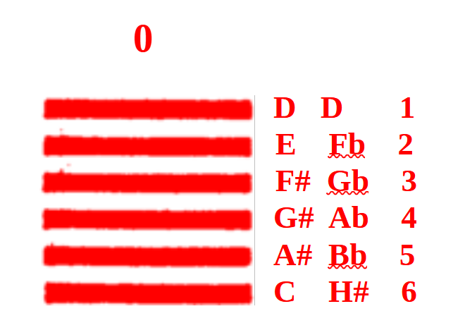 Ebben a rendszerben 15 dúr hangnemet találunk, és minden Hang alatt megtalálható a mi Téridőnk és az Anti-Téridő forrásszámai. Ami rögtön feltűnik, hogy egy kiegyensúlyozott létezési formát adnak ki a forrásszámok.