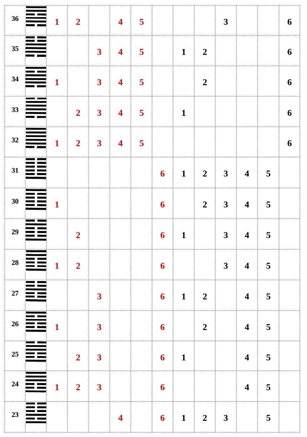 A legfelső, tehát felülről az első sorok váltakozási sorrendje: 1 hosszú, 1 rövid (ez a két rövid), 1 hosszú, 1 rövid, ez ismétlődik 32 alkalommal.