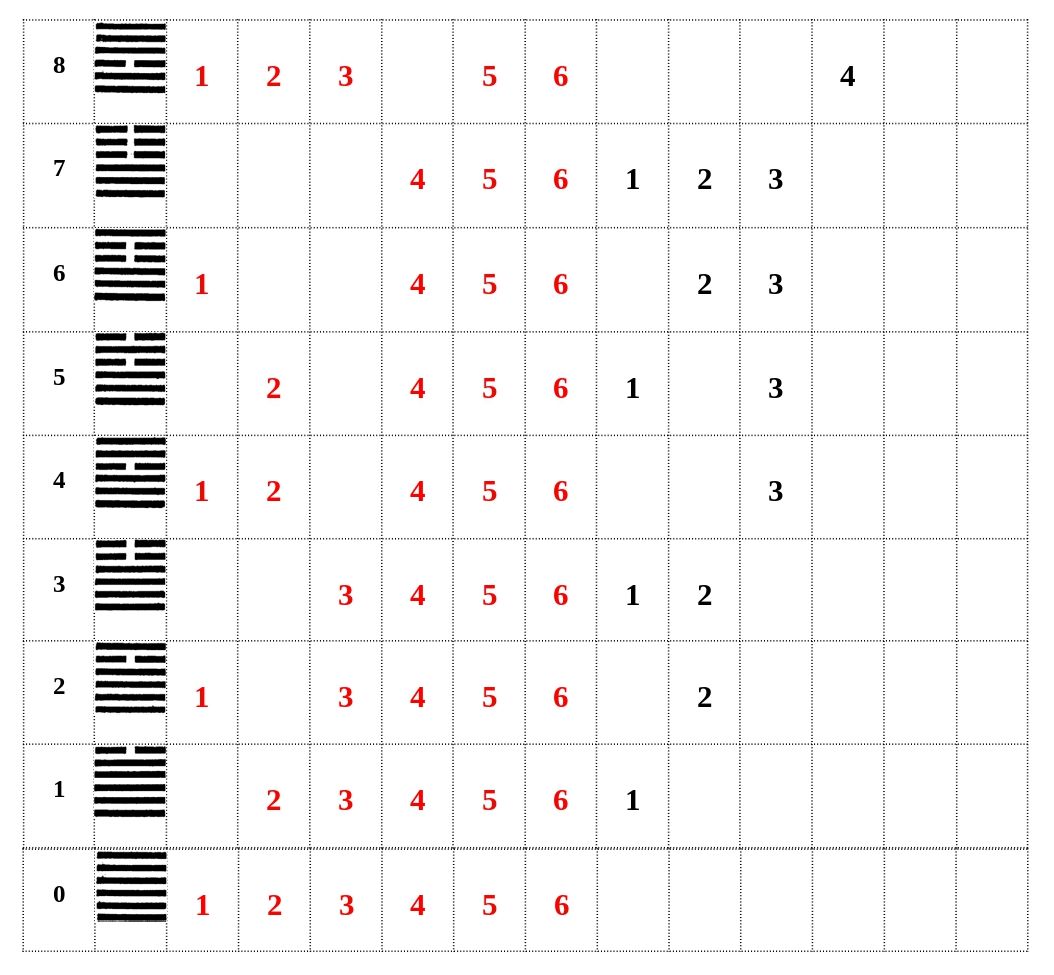 Mi van akkor, ha a kettes számrendszeri szám kevesebb jegyű, mint 6? Mindent „0”- val kell kiegészíteni. Nézzük meg a 10-es számot. A legfelső vonal hosszú, a második rövid, és az utána következő vonalak (három-négy-öt-hat) mind hosszú. Ez a Ji csing táblázatban a 2. jel.