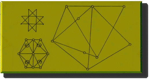 Ezen a lemezen egy szabályos nyolcágú csillagot figyelhetünk meg. Ez a misztikában a fény, vagy energiacsillag, és a modern tudományban ennek ugyan semmi nyoma, de valójában ez a fotínót jeleni. Erre kiterjedtebb magyarázatokat találhatsz a ABLAK folyóirat lapjain. A bal alsó ábra a négyes és a hatos szimmetria keveréke, mert a szabályos hatszög belsejében megfigyelhetünk egy sarkán álló négyzetet is. Itt nem kettő, hanem négy életjel van. Két jobbos, és két balos. Ez is lehet makro és mikrovilági üzenet, esetlen mind a kettő is. Az eredeti megfejtés arra utal, hogy a homo galaxicus kilenc bolygón lakik. Én ezt sehogyan se tudom kiolvasni ebből az ábrából. Ami mégis izgalmas, az az, hogy nagyon hasonlít az emberi lélek energiacentrumának ábrájához. Természetesen ennek is lehet makro értelme is. A kozmosz-szimmetriákra is utalhat, hiszen "úgy fent, mint lent". |