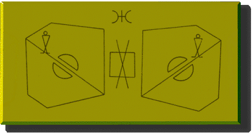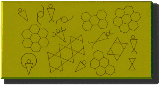 Ezen, és a további lemezeken nagyon sok szimmetriát mutató piktogram mutatkozik. A bal felső sarokban lévő látható ötágú csillag arra utal, hogy a kultúránk közös elemeket hordoz, hiszen ez a jel a Földön mindenhol elterjedten használt. A mindenható jele. Az amerikai zászlón ugyanúgy látható, mint a kommunista Kína nemzeti lobogóján. Egy ideig két magyar címer tetején is szerepelt a vörös ötágú csillag. Mágikus értelmű és hatású jel. A másik két piktogram nagyon hasonló. Mindkét ábrán hat-hat köröcske szerepel vonalakkal összekötve. A baloldali trapézos formán két fura jel is van, amelyet az élet jelének is értékelhetünk. Ez több szempontból is helyes lehet, mert az az idő-visszacsatolás (uroborosz) amit jelent, minden létezés és élet alapja. A lélekszikrát is jelenti. Itt egy jobbos és egy balos jel látszik, ami a fenti csillaggal együtt a tér és az antitér tükörszerű voltára utal. Az öt és a hat szerepeltetése szintén térre utaló. (Nem jut ötről a hatra). |