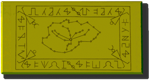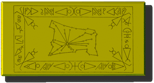 Itt azért most fellebben a fátyol. Ez az ábra már nagy egyezést mutat az általunk ismert csillagképekkel. Ez már a fenti rajzolattal is egyezik. Ezen a lemezen már írásjelek is vannak, és mindegyik "szó" öt írásjelből áll. Két súlyzószerű jel is van a képen, ami nem más mint választójel, vagy más néven spácium, szóköz. Centrumában az Orion csillagkép jobb felső csillaga áll, de a főképpen téli csillagkép minden csillaga fényes és jellegzetes csillaga benne van ebben a szövetségben. A fentebb lévő fehér csillagtérképen rajta vannak azok a csillagképek, amelyek irányába nézve jó irányban (a rokonságod irányába) nézegethetsz az égen. Ez télen éjszaka dél felé látható. Délkeleten kelnek fel, és délnyugaton nyugszanak le. Az eredeti lemezeket értelmező megfejtésben ez áll: PAGASZ, REGASZ, LUTESZ, JUNESZ, VICSESZ, FADOSZ, és a szerző ezeket bolygó vagy személyneveknek gondolja. Az eredeti anyagban sokkal több lemez volt, és ennek segítségével sikerült megfejteni az idegen ABC -t. És itt jön az igazi meglepetés. |