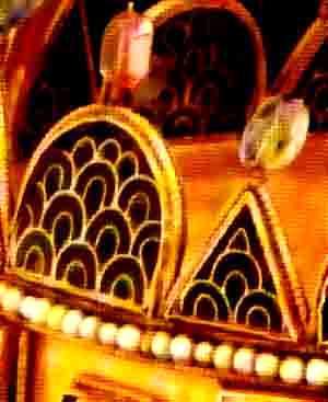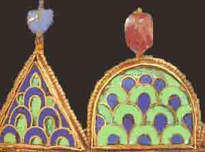 A koronán lévő még mindig tüzes színű zománcok mutatják azt, hogy készíthette volna a mester másképpen is, mert a korona különleges rekeszes technikával készült zománcképein ezt meg is tette. Akkor pedig mi lehet a szerepe ennek a furcsa elemnek? Az alábbi képeken az említett jelenség látható. Emellett két kisebb és két nagyobb háromszögletű tűzelem van a pártarészen, de ezek "fényszögűek", ami tompább szög a Teremtő sebességi szögénél (31.6 fok). Az ABLAK ágon részletesen megmutatjuk a fizikáját. A speciális limitálási szög azt jelenti, hogy a fénykvantumokban ilyen kisebb sebességű tachionok vannak. Ez persze még mindig sokkal gyorsabban mozog a fénysebességnél, és ezért negatív idejű, de Víz típusú belső időrendszerek keletkeznek a belső esszenciális világában. A hat félköríves motívumot jelentő "boltíves" elem Víz típusú jelzés, amelyekből a két legnagyobb elől és hátul van a koronán. A Víz pozitív kiterjedést (pozitív időrendszert) jelent, amire pártaelemek belső ellentett (fordított) színezése ad félreérthetetlen figyelmeztetést. Kék-zöld az egyik és zöld-kék a másik. |