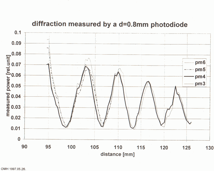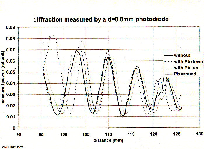 A tömeghullámok hatása a diffrakcióra. 1997.05.26 APPLIED LOGIC LABORATORY OMH ellenőrző mérés. Ezen a lapon két olyan mérési jegyzőkönyv látható, amelyen az Országos Mérésügyi Hivatal megismételt nyolc lényegbevágó mérést, amely során egy zárt kormozott belsejű alumínium csövecskére kívülről különböző szimmetrikus és aszimmetrikus fémtárcsákat húztunk, és azt vizsgáltuk, hogy befolyásolja-e a hő és frekvencia kompenzált lézersugarat, amelyet ezen a kis csövön át egy a csövecske végén egy 0,05 mm vastagságú wolfram diffrakciós szálra vezettünk. Ez a diffrakció csak a jelenség felnagyítását szolgálta. További adatok az angol és az orosz nyelvű lapokon találhatók. Az első mérésnél négy 2 cm vastag és 5 cm ármérőjű és 7 mm furatú ólomtárcsát használtunk, majd levettük. Jól látható, hogy a diffrakció mértéke jelentősen megváltozott a tárcsák sorozatos ráhelyezésével. Amplitúdóban és fázisban (hullámhosszban) is létrejöttek változások. Már ez a mérés is jelzi azt, hogy a tömeghullámok optikailag viselkednek, hiszen minden anyag görbült hullámokat kelt. A szenzáció ebben a mérésben az, hogy itt összesen néhány dekagramm anyag olyan nagy változást idéz elő, amelyet csak galaktikus méretű tömegeknél feltételeztünk. Gondoljunk itt a gravitációs lencse effektusra a galaxisoknál.